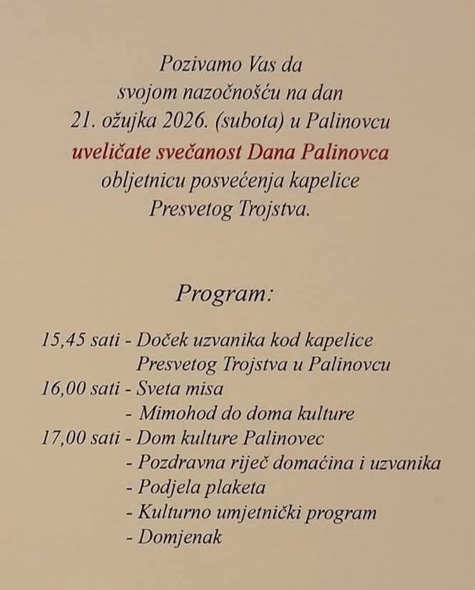 U subotu, 21. ožujka, održat će se Dan Palinovca. Nakon svete mise i kulturno-umjetničkog programa, DVD Palinovec organizira zabavu uz živu glazbu i bogatu tombolu. Svi ste pozvani!